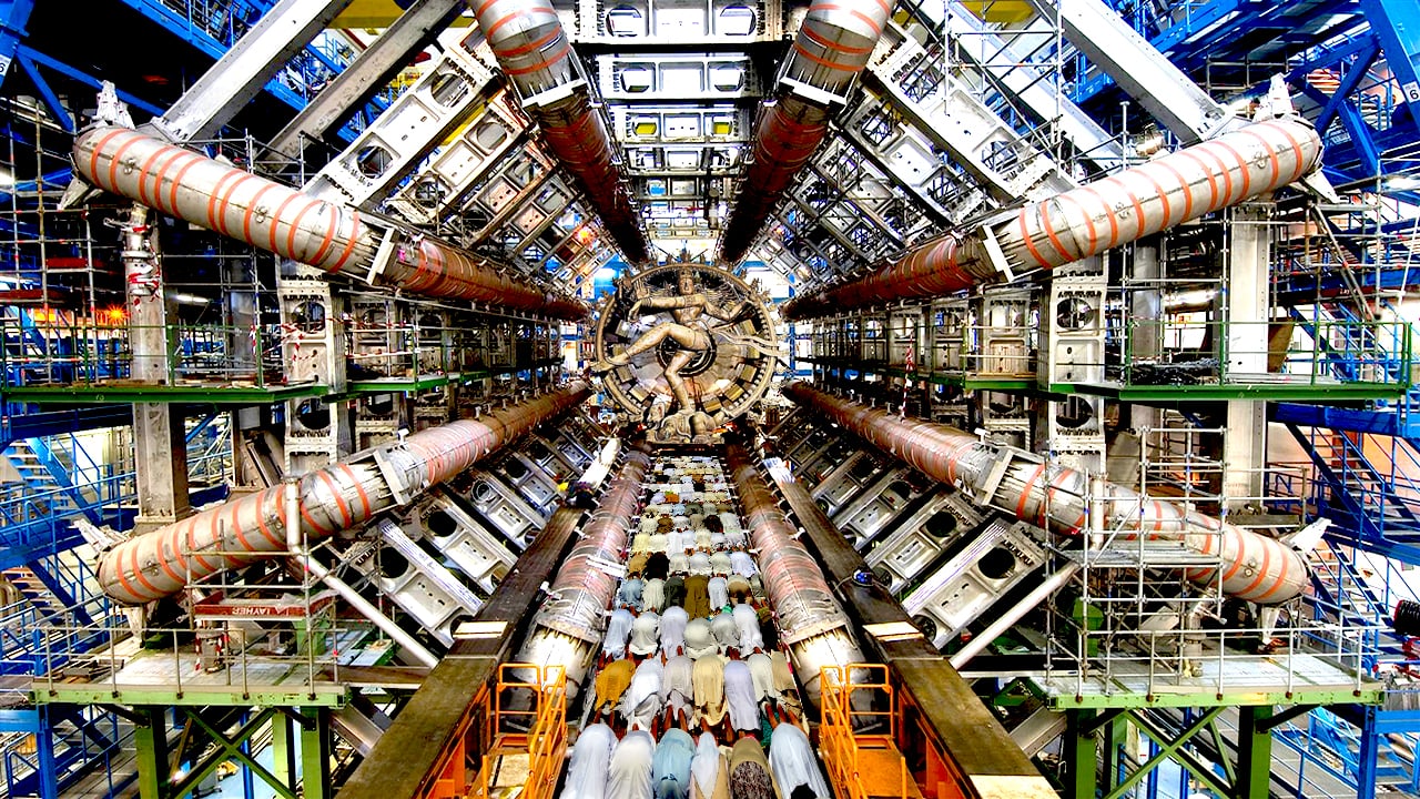 15:07 - "A tradition continued today by its modern practitioners who still develop their fetishistic machines with mystical creationist theories proposing an energy only universe" By modern practitioners the film is referring to modern scientists at places like CERN and such.